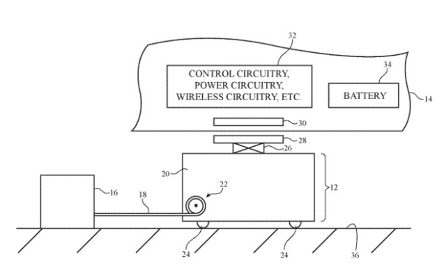 蘋果創(chuàng)建一個可以在地板上移動的設(shè)備,一旦觸發(fā)就可以移動。在移動到位后,該裝置然后通過基座安裝的接收器向車輛供電。另一個觸發(fā)器可用于斷開設(shè)備并將其縮回。