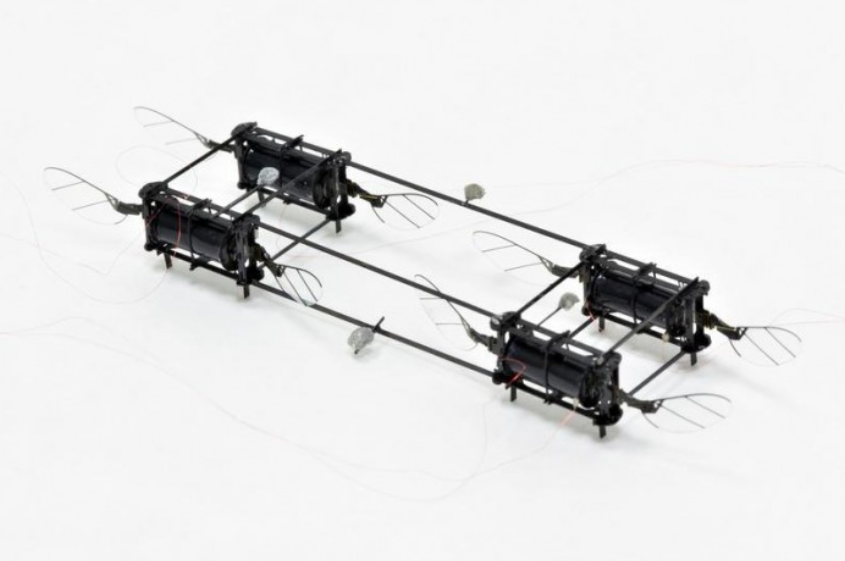 此外,他們甚至還讓兩個四翼模型碰撞以此來證明它們即便在相撞后仍能繼續(xù)飛行。他們還用四個致動器建立了一個八翼的。