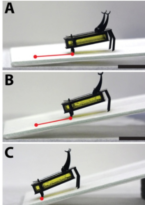 這對于解決微型機(jī)器人能量來源問題上意義重大。不同于其他依靠電池或外接電線驅(qū)動的微型機(jī)器人,該微型機(jī)器人的能量來源是甲醇。值得一題的是,甲醇在正常大氣壓下以液體形式儲存,能量是小型電池的10倍以上。這意味著利用甲醇驅(qū)動的微型機(jī)器人自主性更強(qiáng),同時(shí)可以保持較小的體積。為了驗(yàn)證在甲醇驅(qū)動下機(jī)器人的運(yùn)動性能,研究人員進(jìn)行了兩組實(shí)驗(yàn),分別測試了斜面傾斜角度爬坡能力和粗糙程度不同表面上的爬行能力。