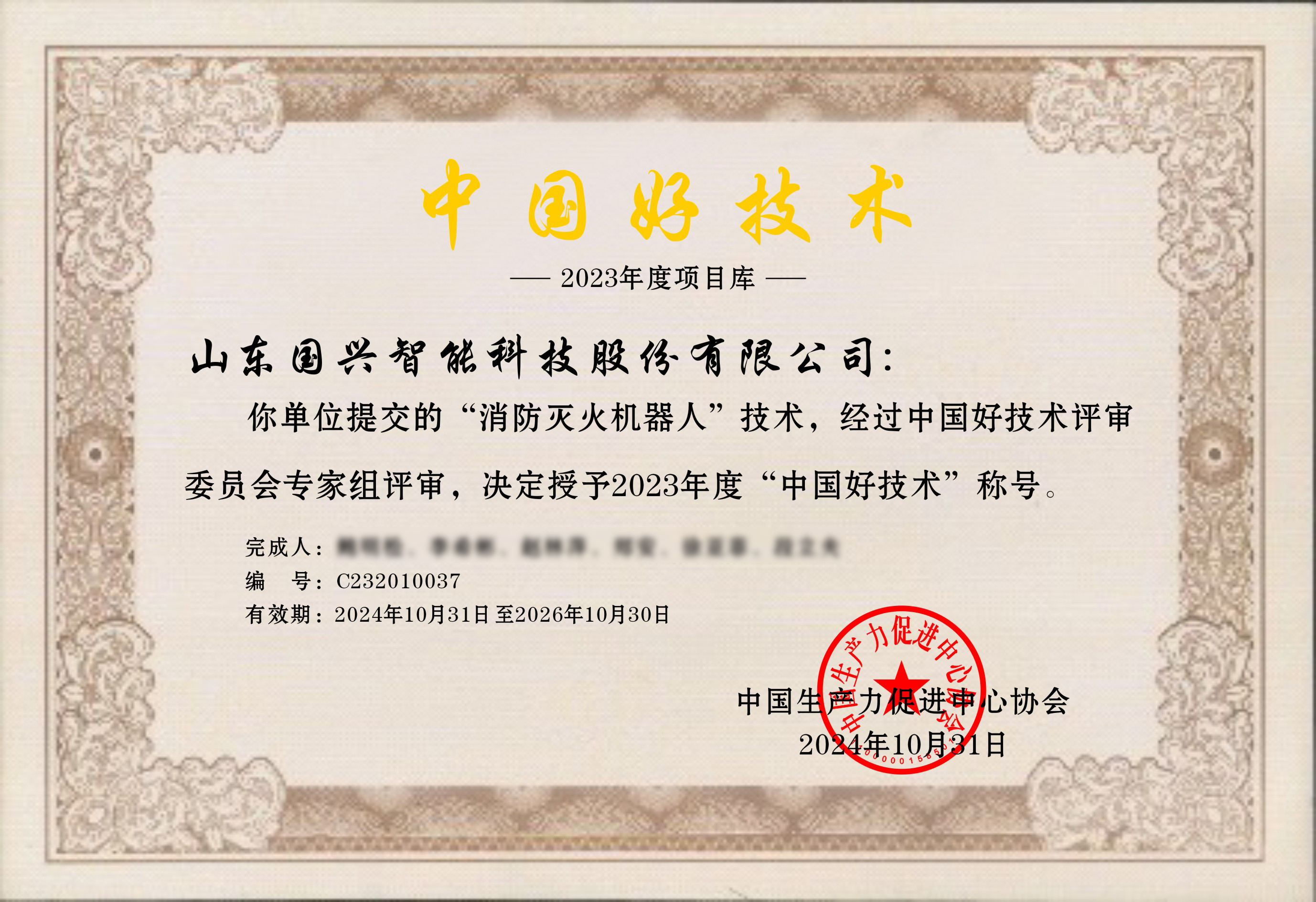 近日,中國生產(chǎn)力促進中心協(xié)會公布2023年度“中國好技術”評審結(jié)果,山東國興智能科技股份有限公司“消防滅火機器人”項目入選。