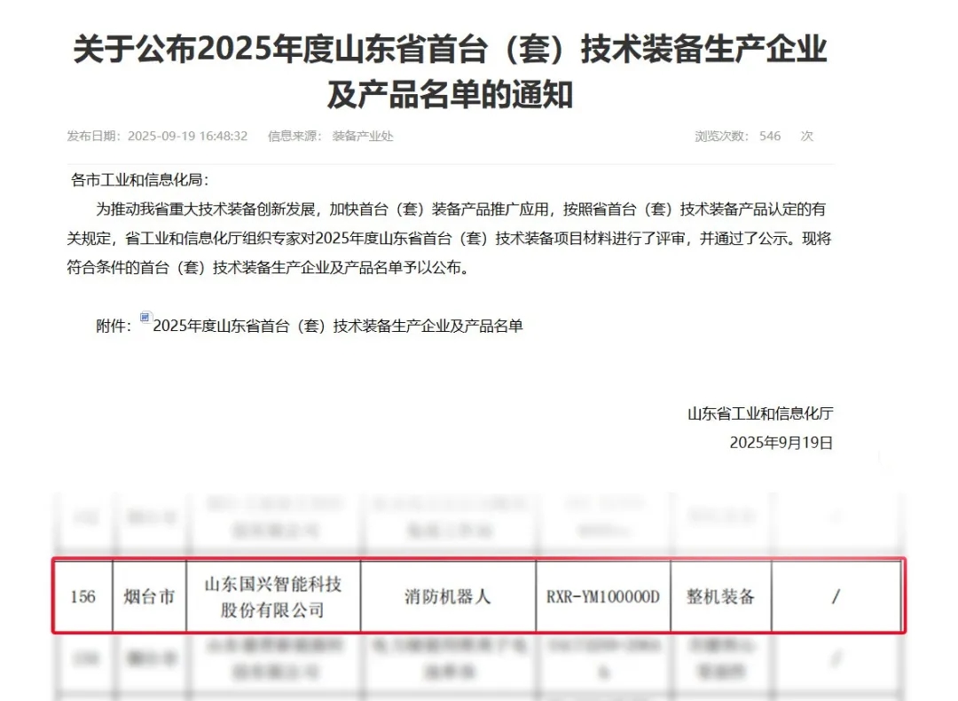 為推動(dòng)山東省高端裝備產(chǎn)業(yè)高質(zhì)量發(fā)展,加快培育新質(zhì)生產(chǎn)力,充分發(fā)揮首臺(tái)(套)政策的支撐作用——“2025年度山東省首臺(tái)(套)技術(shù)裝備生產(chǎn)企業(yè)及產(chǎn)品名單”正式公布。山東國(guó)興智能科技股份有限公司消防機(jī)器人RXR-YM100000D成功登榜。