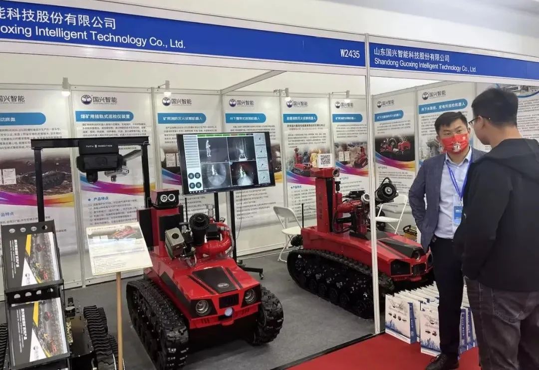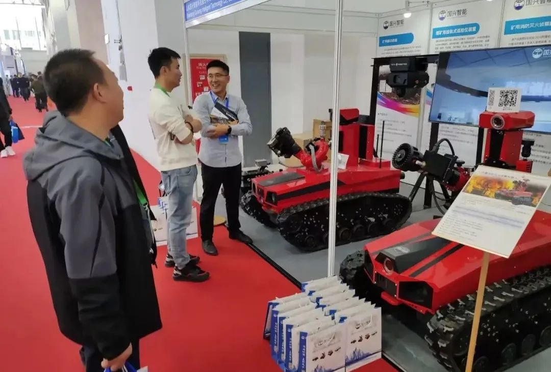 展會上,國興智能全面展示了自主研發(fā)的智慧煤礦產(chǎn)品,礦用掛軌巡檢機器人現(xiàn)場展示如何在既定軌道上實現(xiàn)自主拍攝、巡檢、熱成像、爬坡、檢測等功能,吸引了眾多煤炭行業(yè)從業(yè)者的關(guān)注;更有井下履帶式探測機器人、礦用消防滅火偵察機器人等產(chǎn)品現(xiàn)場展出,不少與會者表達出合作意愿。