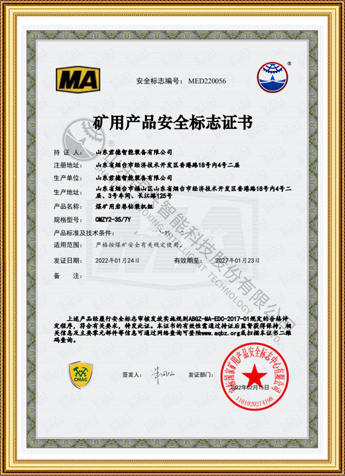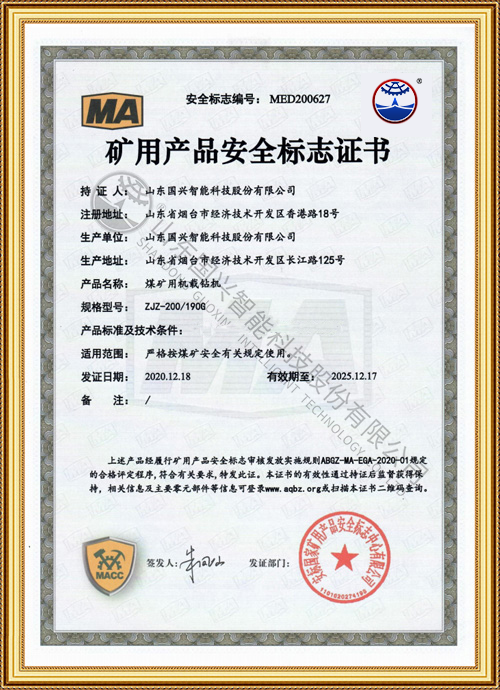 煤礦用機(jī)載鉆機(jī)煤安證書